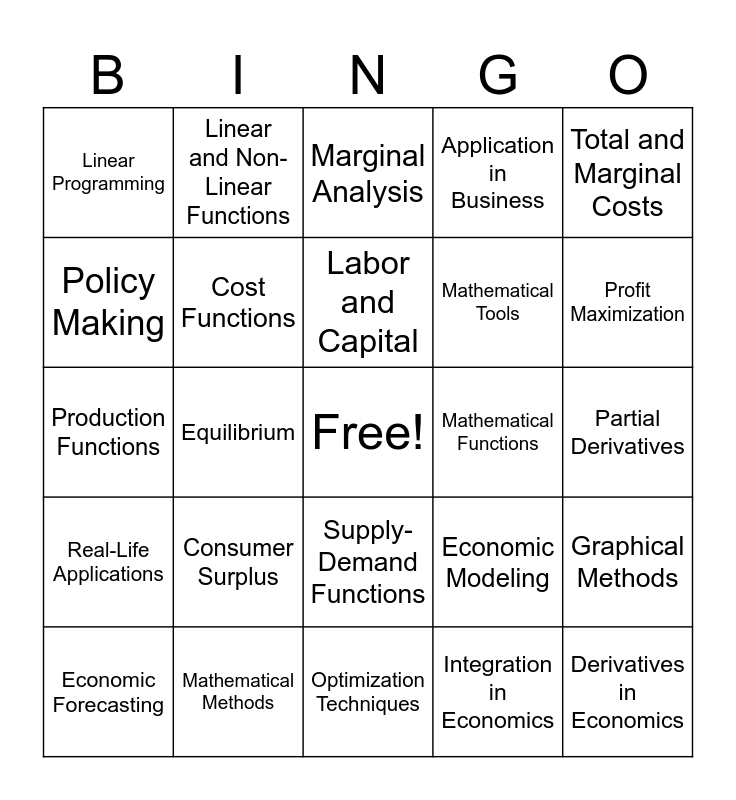 This bingo card has a free space and 30 words: Mathematical Methods, Optimization, Equilibrium, Comparative Statics, Linear Programming, Marginal Analysis, Cost Functions, Supply-Demand Functions, Mathematical Functions, Optimization Techniques, Partial Derivatives, Derivatives in Economics, Integration in Economics, Resource Allocation, Profit Maximization, Utility Functions, Economic Modeling, Real-Life Applications, Consumer Surplus, Total and Marginal Costs, Production Functions, Diminishing Returns, Linear and Non-Linear Functions, Mathematical Tools, Policy Making, Application in Business, Graphical Methods, Economic Forecasting, Labor and Capital and Total Revenue and Cost.