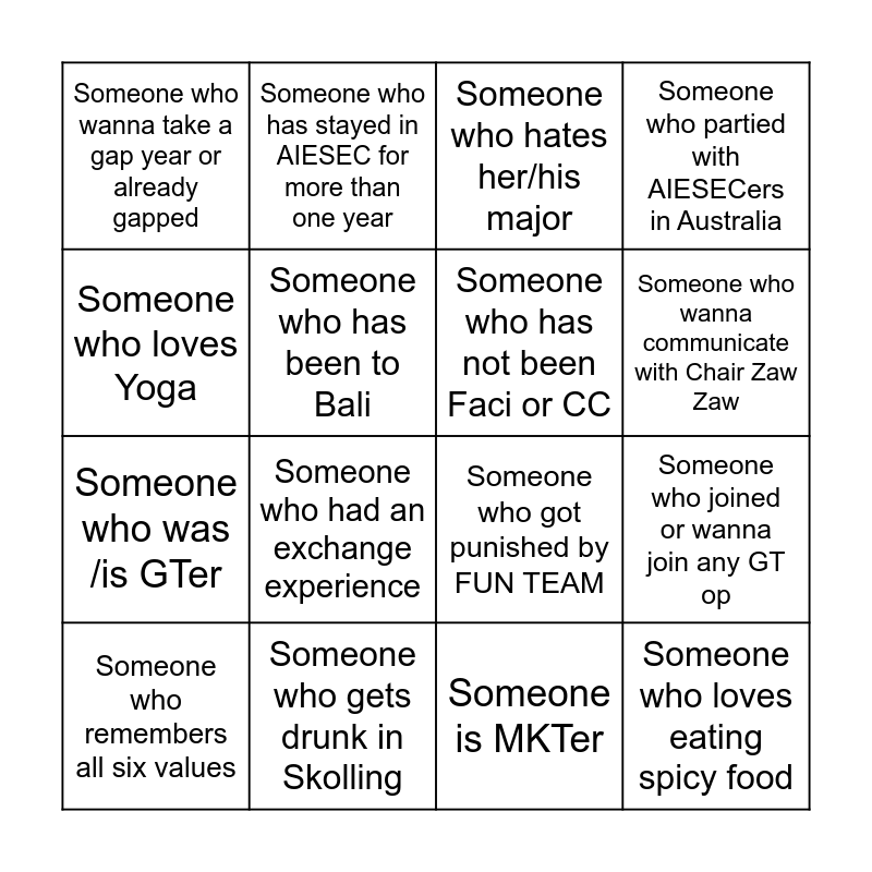 This bingo card has 22 words: Someone who gets drunk in Skolling, Someone who has watched Zootopia, Someone who has stayed in AIESEC for more than one year, Someone who made an APD this term, Someone who has been to Bali, Someone who has not been Faci or CC, Someone who wanna take a gap year or already gapped, Someone who hates her/his major, Someone who got punished by FUN TEAM, Someone who loves eating spicy food, Someone who was /is GTer, Someone who partied with AIESECers in Australia, Someone who is/ was/ wanna be a LCP, Someone who has a hilarious story from your LC, Someone is MKTer, Someone who interns/interned in major internet companies, Someone who joined or wanna join any GT op, Someone who remembers all six values, Someone who had an exchange experience, Someone who loves Yoga, Someone who wanna communicate with Chair Zaw Zaw and Someone who has been Faci or CC.