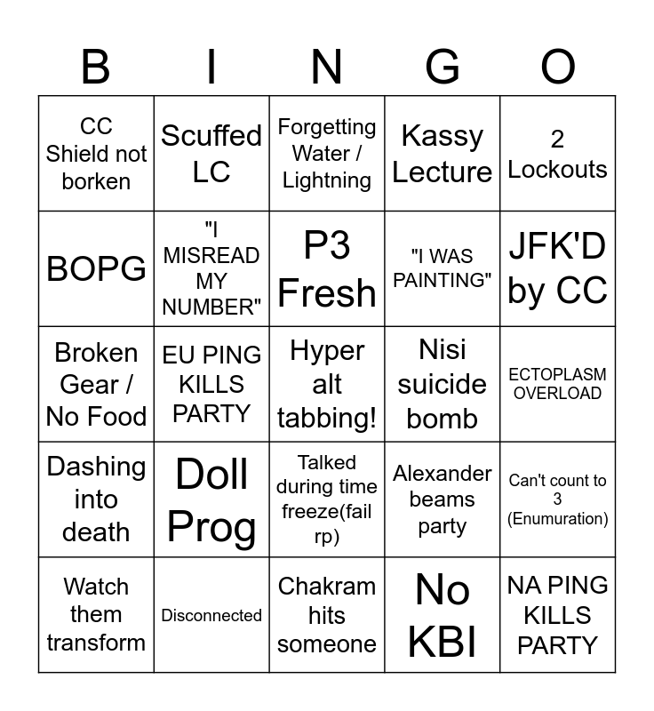 This bingo card has a free space and 24 words: Doll Prog, Disconnected, P3 Fresh, Watch them transform, 2 Lockouts, CC Shield not borken, BOPG, Scuffed LC, Nisi suicide bomb, Talked during time freeze(fail rp), "I WAS PAINTING", Broken Gear / No Food, Alexander beams party, Can't count to 3 (Enumuration), "I MISREAD MY NUMBER", No KBI, ECTOPLASM OVERLOAD, Forgetting Water / Lightning, JFK'D by CC, EU PING KILLS PARTY, NA PING KILLS PARTY, Dashing into death, Kassy Lecture and Chakram hits someone.