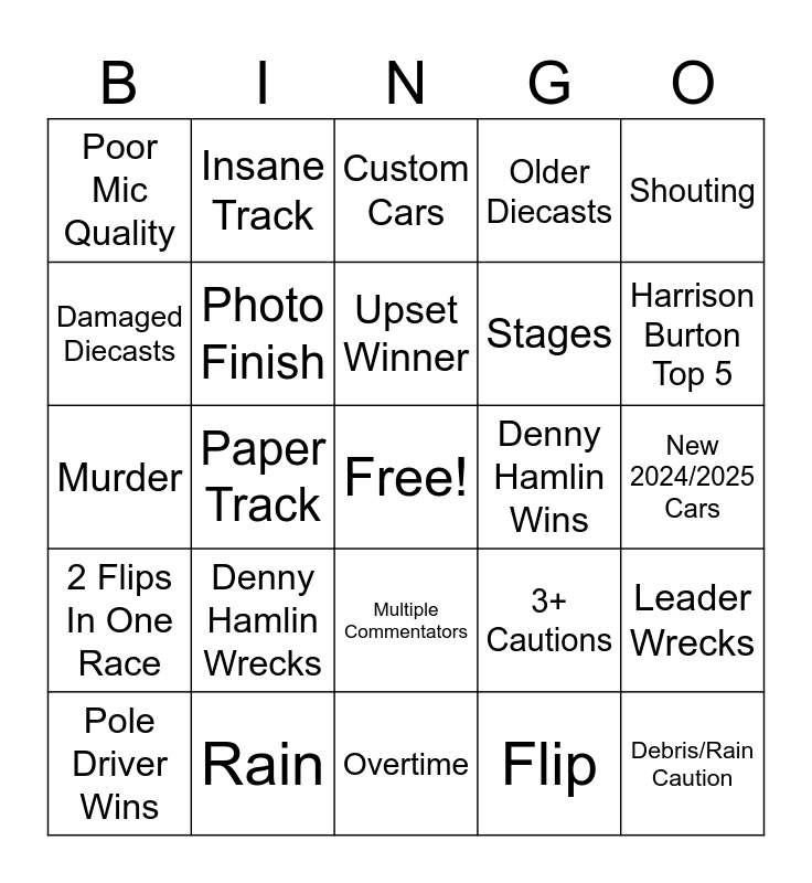 This bingo card has a free space and 24 words: Pole Driver Wins, Denny Hamlin Wrecks, Upset Winner, Flip, Shouting, Poor Mic Quality, Insane Track, Custom Cars, Denny Hamlin Wins, New 2024/2025 Cars, Murder, Photo Finish, 3+ Cautions, Leader Wrecks, Damaged Diecasts, Rain, Overtime, Older Diecasts, Harrison Burton Top 5, 2 Flips In One Race, Paper Track, Multiple Commentators, Stages and Debris/Rain Caution.