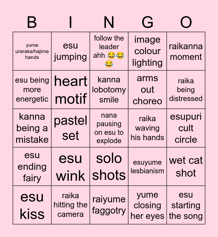 This bingo card has a free space and 24 words: esu wink, raika hitting the camera, kanna lobotomy smile, esu kiss, raikanna moment, yume uraraka/hajime hands, esu being more energetic, esu jumping, raika waving his hands, solo shots, arms out choreo, kanna being a mistake, esuyume lesbianism, wet cat shot, heart motif, yume closing her eyes, esupuri cult circle, follow the leader ahh 😂😂😂, raika being distressed, pastel set, esu starting the song, esu ending fairy, image colour lighting and raiyume faggotry.