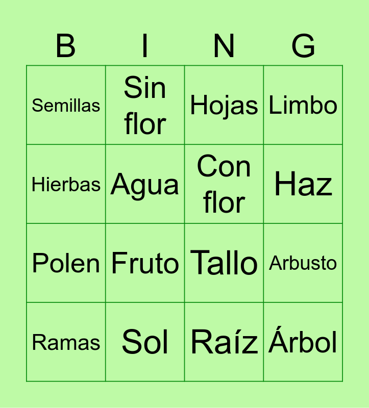 This bingo card has 19 words: Tallo, Flor, Hojas, Árbol, Arbusto, Hierbas, Raíz, Semillas, Sin flor, Polen, Fruto, Agua, Con flor, Sol, Ramas, Pecíolo, Limbo, Haz and Envés.