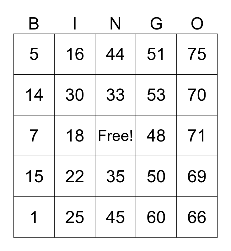 This bingo card has a free space and 24 words: 1, 22, 33, 60, 75, 5, 16, 44, 48, 71, 7, 30, 50, 69, 14, 25, 45, 51, 70, 15, 18, 35, 53 and 66.