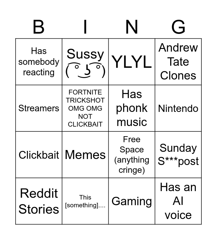 This bingo card has 22 words: This [something]...., Brainrot, Sussy ( ͡° ͜ʖ ͡°), Minecraft but...., FORTNITE TRICKSHOT OMG OMG NOT CLICKBAIT, Has phonk music, Has somebody reacting, YLYL, Free Space (anything cringe), Has an AI voice, Clickbait, Andrew Tate Clones, Pranks, Loop Style, Gaming, Ranking stuf, Sunday S***post, Reddit Stories, Memes, Streamers, Nintendo and Top [insert number here] .....