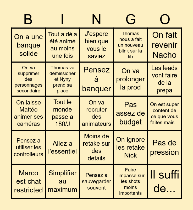 This bingo card has a free space and 24 words: Allez a l'essentiel, Simplifier au maximum, Pensez à banquer, Marco est chat restricted, On fait revenir Nacho, On a une banque solide, On va supprimer des personnages secondaire, Tout a déja été animé au moins une fois, Pas assez de budget, Moins de retake sur des details, On va prolonger la prod, On laisse Mattéo animer ses caméras, On ignore les retake Nick, Pas de pression, Thomas va demissioner et Nyny prend sa place, Faire l'impasse sur les shots moins importants, On est super content de ce que vous faites mais..., J'espere bien que vous le saviez, Les leads vont faire de la prepa, Tout le monde passe a 180/J, Il suffi de..., Pensez a utiliser les controlleurs, Thomas nous a fait un nouveau blink sur la lib and Pensez a sauvegarder souvent.