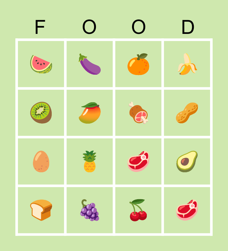 This bingo card has 28 words: 🍎, 🍅, 🥚, 🥔, 🥭, 🍊, 🍆, 🥩, 🍇, 🐟, 🥩, 🍌, 🥕, 🦐, 🍍, 🍓, 🎃, 🍖, 🥜, 🍋, 🍉, 🥒, 🍞, 🥑, 🍒, 🍐, 🥝 and 🫘.