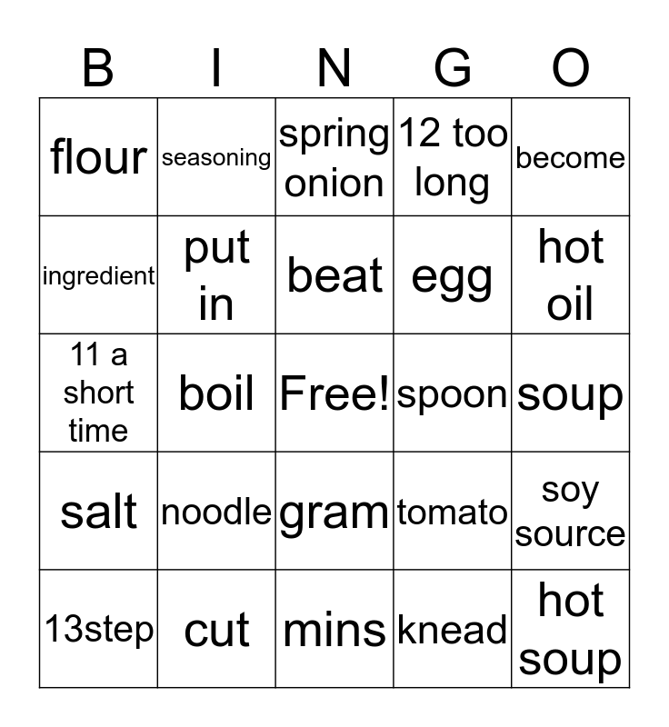 This bingo card has a free space and 27 words: tomato, stir fry, egg, mins, ingredient, spring onion, seasoning, salt, spoon, soy source, 11 a short time, 12 too long, 13step, cut, hot oil, when, put in, beat, noodle, flour, soup, knead, boil, hot soup, gram, become and dough.