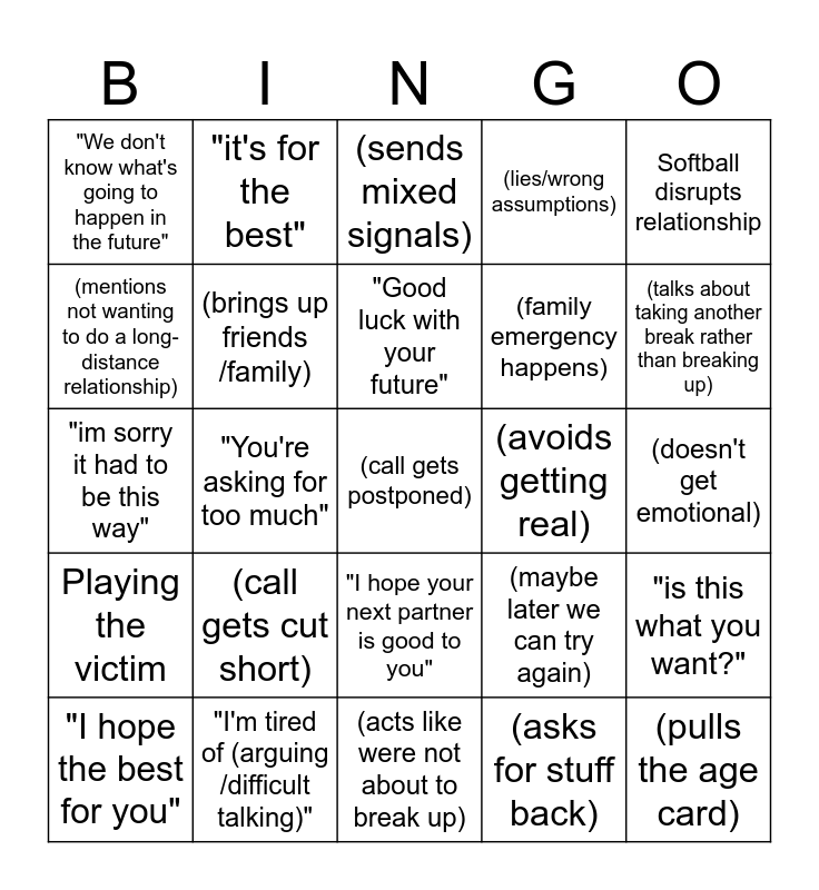 This bingo card has a free space and 39 words: "It's not you, it's me", (trying to make it work out), (not answering questions), (brings up friends /family), "I hope the best for you", "I hope your next partner is good to you", "Good luck with your future", ('Brandon is unable to handle something'), Softball disrupts relationship, Playing the victim, "You're asking for too much", (lies/wrong assumptions), (pulls the age card), (doesn't get emotional), (avoids getting real), (call gets cut short), (is shocked by decisions), "We don't know what's going to happen in the future", (doubles down on victim card), (maybe later we can try again), (mentions not wanting to do a long-distance relationship), (acts like were not about to break up), (family emergency happens), (talks about taking another break rather than breaking up), "can we still be friends", "I need to work on myself", "I'm not ready for this kind of relationship", "you deserve better", "maybe were just not right for each other", "it's for the best", "I think im gay", (is disrespectful to one another), (sends mixed signals), "I'm tired of (arguing /difficult talking)", (asks for stuff back), (asks for another chance), "is this what you want?", "im sorry it had to be this way" and (backhanded compliment /insult).