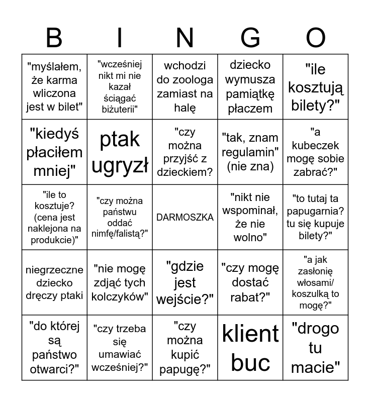 This bingo card has a free space and 24 words: "nie mogę zdjąć tych kolczyków", "czy trzeba się umawiać wcześniej?", "czy można przyjść z dzieckiem?, "do której są państwo otwarci?", "ile kosztują bilety?", "myślałem, że karma wliczona jest w bilet", "kiedyś płaciłem mniej", "wcześniej nikt mi nie kazał ściągać biżuterii", "nikt nie wspominał, że nie wolno", "gdzie jest wejście?", "tak, znam regulamin" (nie zna), "ile to kosztuje? (cena jest naklejona na produkcie)", "czy mogę dostać rabat?", "a jak zasłonię włosami/ koszulką to mogę?", ptak ugryzł, klient buc, "to tutaj ta papugarnia? tu się kupuje bilety?", wchodzi do zoologa zamiast na halę, "a kubeczek mogę sobie zabrać?", "czy można państwu oddać nimfę/falistą?", "drogo tu macie", niegrzeczne dziecko dręczy ptaki, dziecko wymusza pamiątkę płaczem and "czy można kupić papugę?".