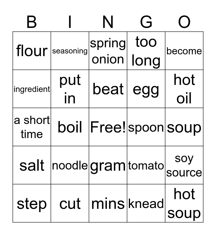 This bingo card has a free space and 27 words: tomato, stir fry, egg, mins, ingredient, spring onion, seasoning, salt, spoon, soy source, a short time, too long, step, cut, hot oil, when, put in, beat, noodle, flour, soup, knead, boil, hot soup, gram, become and dough.