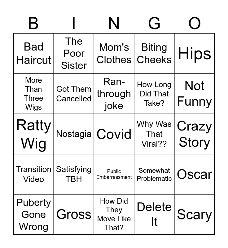 This bingo card has a free space and 24 words: Satisfying TBH, Gross, Ran-through joke, Puberty Gone Wrong, Hips, Bad Haircut, More Than Three Wigs, The Poor Sister, Why Was That Viral??, Public Embarrassment, How Long Did That Take?, Ratty Wig, Somewhat Problematic, Oscar, Got Them Cancelled, Delete It, Crazy Story, Mom's Clothes, Not Funny, Nostagia, Scary, Transition Video, Biting Cheeks and How Did They Move Like That?.