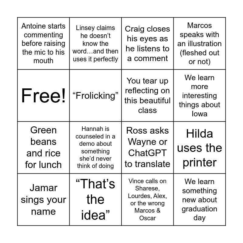 This bingo card has 16 words: “That’s the idea”, Hilda uses the printer, Craig closes his eyes as he listens to a comment, Antoine starts commenting before raising the mic to his mouth, Green beans and rice for lunch, Linsey claims he doesn’t know the word…and then uses it perfectly, Ross asks Wayne or ChatGPT to translate, Vince calls on Sharese, Lourdes, Alex, or the wrong Marcos & Oscar, Free!, “Frolicking”, Jamar sings your name, Marcos speaks with an illustration (fleshed out or not), Hannah is counseled in a demo about something she’d never think of doing, We learn more interesting things about Iowa, You tear up reflecting on this beautiful class and We learn something new about graduation day.