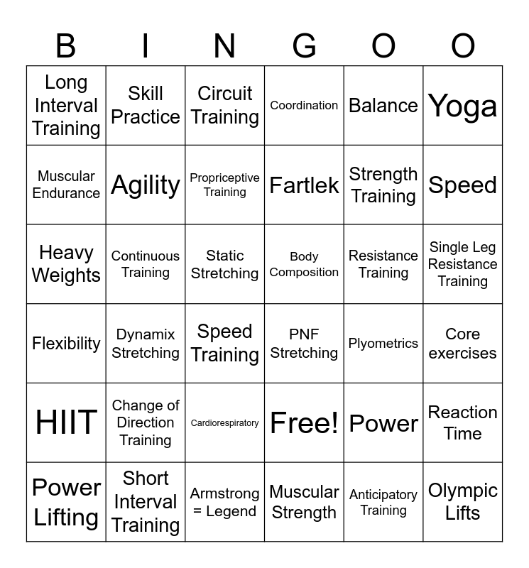 This bingo card has 36 words: Free!, Cardiorespiratory, Muscular Strength, Muscular Endurance, Flexibility, Body Composition, Agility, Armstrong = Legend, Balance, Power, Speed, Coordination, Reaction Time, Continuous Training, Fartlek, Long Interval Training, HIIT, Resistance Training, Heavy Weights, Circuit Training, Static Stretching, Dynamix Stretching, PNF Stretching, Speed Training, Plyometrics, Skill Practice, Strength Training, Short Interval Training, Propriceptive Training, Yoga, Olympic Lifts, Power Lifting, Core exercises, Single Leg Resistance Training, Change of Direction Training and Anticipatory Training.