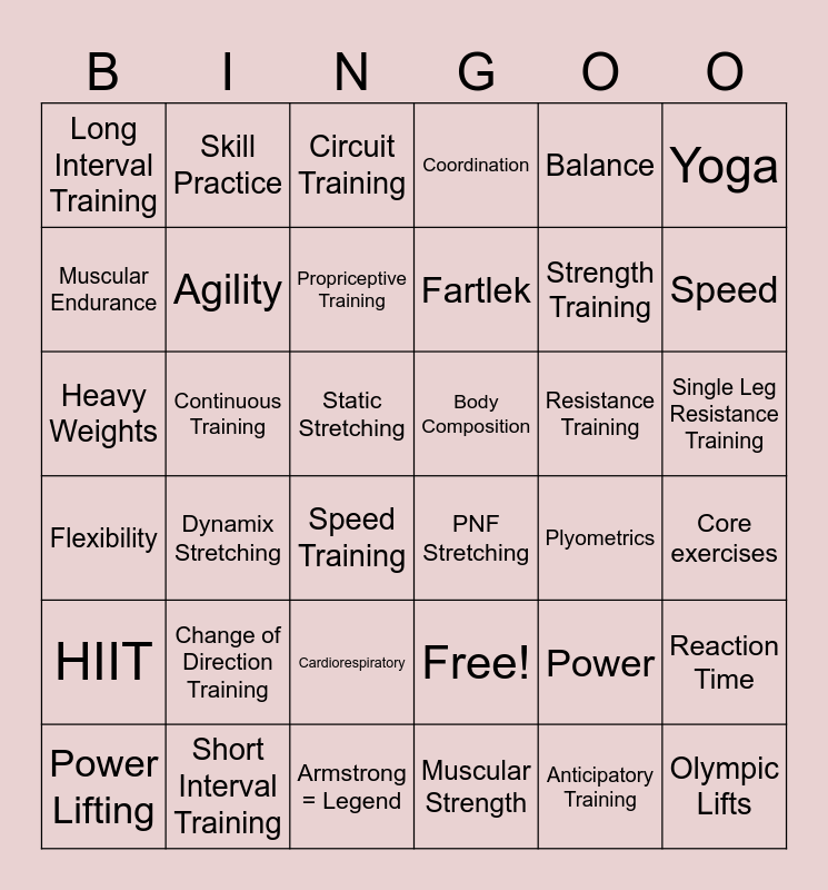 This bingo card has 36 words: Free!, Cardiorespiratory, Muscular Strength, Muscular Endurance, Flexibility, Body Composition, Agility, Armstrong = Legend, Balance, Power, Speed, Coordination, Reaction Time, Continuous Training, Fartlek, Long Interval Training, HIIT, Resistance Training, Heavy Weights, Circuit Training, Static Stretching, Dynamix Stretching, PNF Stretching, Speed Training, Plyometrics, Skill Practice, Strength Training, Short Interval Training, Propriceptive Training, Yoga, Olympic Lifts, Power Lifting, Core exercises, Single Leg Resistance Training, Change of Direction Training and Anticipatory Training.