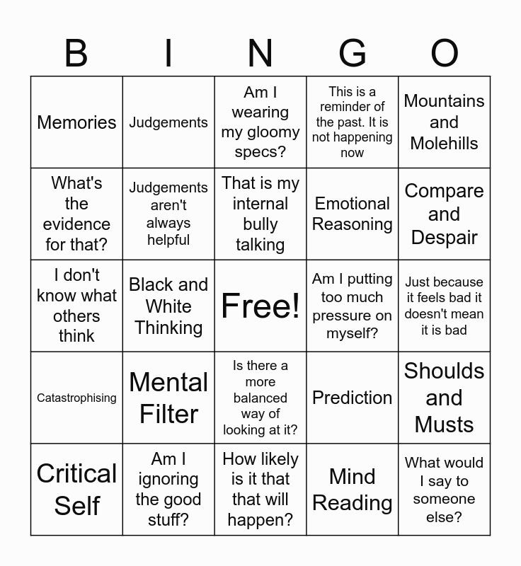 This bingo card has a free space and 24 words: Mental Filter, Am I ignoring the good stuff?, That is my internal bully talking, Critical Self, Mountains and Molehills, Memories, What's the evidence for that?, Judgements, Am I putting too much pressure on myself?, Is there a more balanced way of looking at it?, Emotional Reasoning, I don't know what others think, Prediction, Shoulds and Musts, Judgements aren't always helpful, Mind Reading, Just because it feels bad it doesn't mean it is bad, Am I wearing my gloomy specs?, Compare and Despair, Black and White Thinking, What would I say to someone else?, Catastrophising, This is a reminder of the past. It is not happening now and How likely is it that that will happen?.