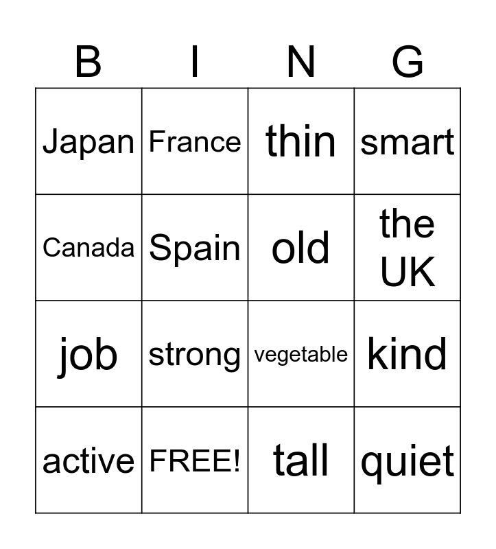 This bingo card has 25 words: China, the USA, the UK, Australia, Canada, Japan, Spain, France, FREE!, number, job, vegetable, yound, funny, old, short, tall, thin, strong, kind, active, strict, quiet, smart and new.