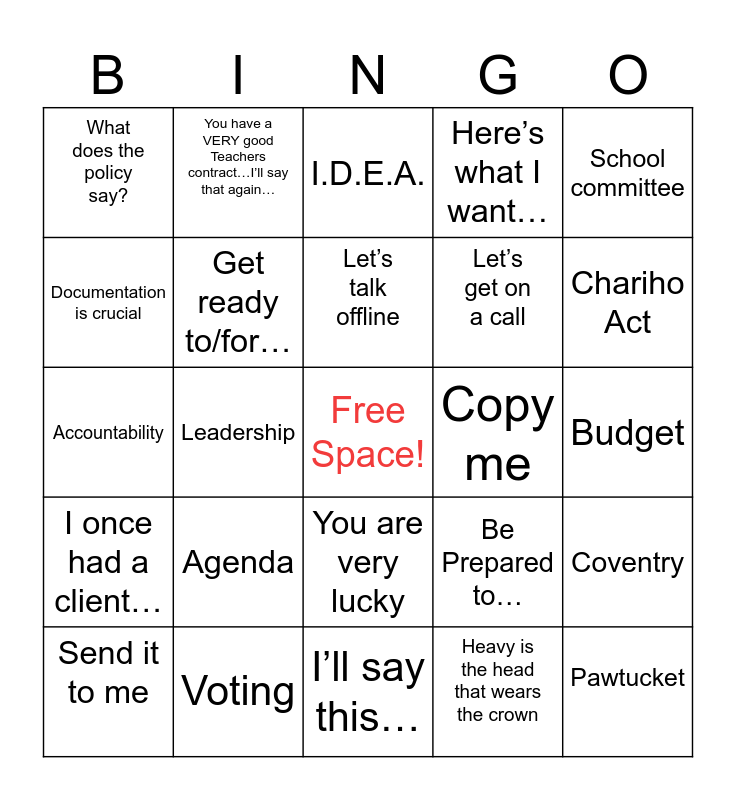 This bingo card has a free space and 24 words: Send it to me, Agenda, Let’s talk offline, Heavy is the head that wears the crown, School committee, What does the policy say?, You have a VERY good Teachers contract…I’ll say that again…, I.D.E.A., Copy me, Budget, Accountability, Get ready to/for…, Be Prepared to…, Coventry, Documentation is crucial, Voting, I’ll say this…, Here’s what I want…, Chariho Act, I once had a client…, Leadership, You are very lucky, Let’s get on a call and Pawtucket.