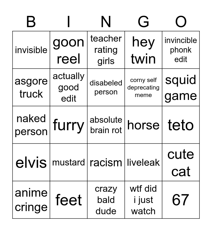 This bingo card has a free space and 24 words: mustard, feet, disabeled person, anime cringe, invincible phonk edit, invisible, asgore truck, goon reel, horse, racism, corny self deprecating meme, naked person, liveleak, cute cat, actually good edit, wtf did i just watch, teto, teacher rating girls, squid game, furry, 67, elvis, hey twin and crazy bald dude.