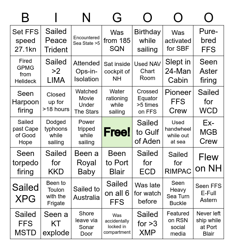 This bingo card has a free space and 48 words: Was late for watch before, Slept in 24-Man Cabin, Was accidentally locked in compartment, Dodged typhoons while sailing, Watched Movie Under The Stars, Ex-MGB Crew, Sailed Peace Trident, Seen a KT explode, Was activated for SBF, Been to Port Blair, Pure-bred FFS, Was from 185 SQN, Pioneer FFS Crew, Crossed Equator >5 times on FFS, Sailed XPG, Used handwheel while out at sea, Fired GPMG from Helideck, Seen Aster firing, Seen Heavy Sea Turn Buckle, Birthday while sailing, Used NAV Chart Room, Power tripped while sailing, Set FFS speed 27.1kn, Sailed >2 LIMA, Seen FFS E-Full Astern, Attended Ops-in-Isolation, Sailed for WCD, Sailed FFS MSTD, Water rationing while sailing, Closed up for >18 hours, Featured on RSN social media, Sailed to Gulf of Aden, Flew on NH, Been to Toulon with the Frigate, Sailed past Cape of Good Hope, Sailed for ECD, Sailed for RIMPAC, Seen Harpoon firing, Been a Royal Baby, Sailed to Australia, Seen torpedo firing, Never left ship while at Port Blair, Encountered Sea State >5, Shore leave via Sonar Door, Sat inside cockpit of NH, Sailed on all 6 FFS, Sailed for KKD and Sailed for >3 XMP.