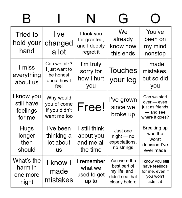 This bingo card has a free space and 24 words: I've been thinking a lot about us, I know I made mistakes, I'm truly sorry for how I hurt you, What’s the harm in one more night, You’ve been on my mind nonstop, Tried to hold your hand, I miss everything about us, I’ve changed a lot, I’ve grown since we broke up, I still think about you and me all the time, Touches your leg, I know you still have feelings for me, Just one night — no expectations, no strings, Breaking up was the worst decision I’ve ever made, Can we talk? I just want to be honest about how I feel, You were the best part of my life, and I didn’t see that clearly before, Can we start over — even just as friends — and see where it goes?, I took you for granted, and I deeply regret it, I made mistakes, but so did you, Why would you of come if you didn’t want me too, I know you still have feelings for me, even if you won’t admit it, Hugs longer then should, We already know how this ends and I remember what we used to get up to.