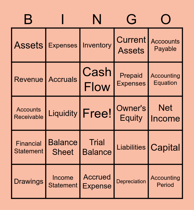 This bingo card has a free space and 24 words: Balance Sheet, Income Statement, Cash Flow, Drawings, Accoounts Payable, Assets, Revenue, Expenses, Owner's Equity, Trial Balance, Prepaid Expenses, Accounts Receivable, Liabilities, Capital, Accruals, Depreciation, Net Income, Inventory, Accounting Equation, Liquidity, Accounting Period, Financial Statement, Current Assets and Accrued Expense.
