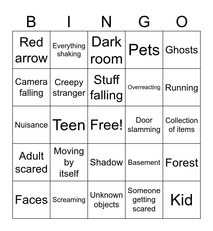 This bingo card has a free space and 24 words: Moving by itself, Screaming, Stuff falling, Faces, Ghosts, Red arrow, Camera falling, Everything shaking, Door slamming, Shadow, Overreacting, Nuisance, Basement, Forest, Creepy stranger, Someone getting scared, Collection of items, Dark room, Running, Teen, Kid, Adult scared, Pets and Unknown objects.