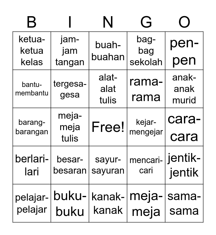 This bingo card has a free space and 24 words: besar-besaran, buku-buku, alat-alat tulis, pelajar-pelajar, pen-pen, ketua-ketua kelas, bantu-membantu, jam-jam tangan, kejar-mengejar, sayur-sayuran, rama-rama, barang-barangan, mencari-cari, jentik-jentik, tergesa-gesa, meja-meja, cara-cara, buah-buahan, anak-anak murid, meja-meja tulis, sama-sama, berlari-lari, bag-bag sekolah and kanak-kanak.