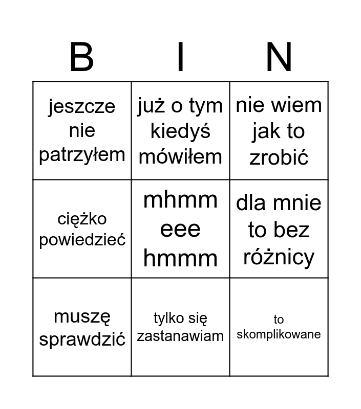 This bingo card has a free space and 12 words: zrobie to co chcecie, nie wiem, to skomplikowane, dla mnie to bez różnicy, już o tym kiedyś mówiłem, nie wiem jak to zrobić, tylko się zastanawiam, głośno myśle, jeszcze nie patrzyłem, ciężko powiedzieć, muszę sprawdzić and mówie tak na przyszłość.