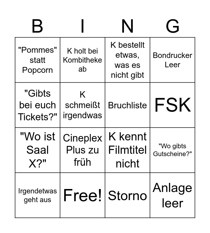 This bingo card has 21 words: Free!, K bestellt bei Abholtheke, K holt bei Kombitheke ab, K zeigt Ticket, Storno, Bruchliste, "Pommes" statt Popcorn, K bestellt etwas, was es nicht gibt, K kennt Filmtitel nicht, FSK, "Wo ist Saal X?", Bondrucker Leer, Anlage leer, Kaffeemaschine, K schmeißt irgendwas, K will reservieren, Irgendetwas geht aus, Cineplex Plus zu früh, "Gibts bei euch Tickets?", "Wo gibts Gutscheine?" and K sucht den Asiaten.