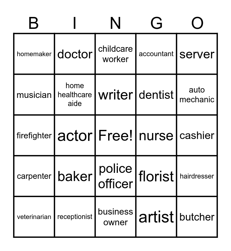 This bingo card has a free space and 24 words: baker, receptionist, writer, veterinarian, server, homemaker, musician, doctor, nurse, police officer, dentist, firefighter, florist, hairdresser, home healthcare aide, artist, cashier, childcare worker, auto mechanic, actor, butcher, carpenter, accountant and business owner.