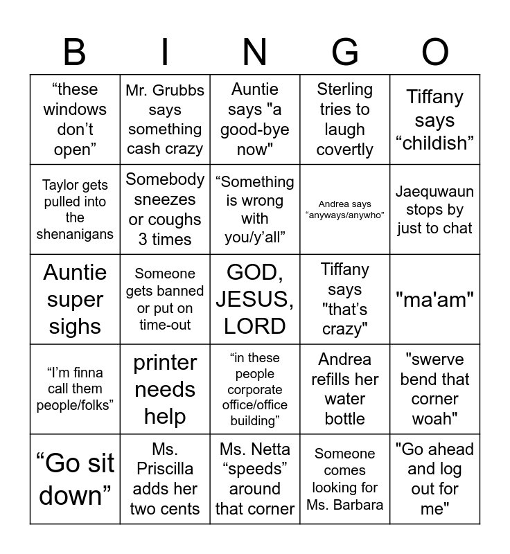 This bingo card has a free space and 31 words: Ms. Netta “speeds” around that corner, Someone is invited on a walk, Someone gets banned or put on time-out, Auntie starts singing hymns, “these windows don’t open”, Auntie says "a good-bye now", Somebody sneezes or coughs 3 times, Andrea refills her water bottle, Tiffany says "that’s crazy", Someone comes looking for Ms. Barbara, "ma'am", "Go ahead and log out for me", Reconnect goes down, Ms. Tiffani gets/has a look on her face, Jaequwaun stops by just to chat, Corey moseys over, "swerve bend that corner woah", printer needs help, “I’m finna call them people/folks”, “in these people corporate office/office building”, Tiffany says “childish”, name we can’t pronounce, “Go sit down”, Mr. Grubbs says something cash crazy, Andrea says “anyways/anywho”, Taylor gets pulled into the shenanigans, Sterling tries to laugh covertly, Auntie super sighs, Ms. Priscilla adds her two cents, “Something is wrong with you/y’all” and Jasmine + Sterling = “siblings wwe match”.