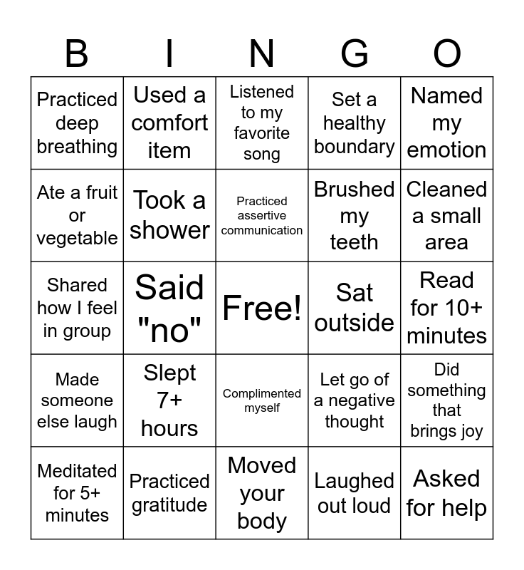 This bingo card has a free space and 29 words: Meditated for 5+ minutes, Ate a full meal, Said "no", Wrote in journal, Practiced deep breathing, Listened to my favorite song, Took a shower, Slept 7+ hours, Sat outside, Practiced gratitude, Read for 10+ minutes, Asked for help, Moved your body, Laughed out loud, Cleaned a small area, Stretched, Complimented myself, Made someone else laugh, Named my emotion, Shared how I feel in group, Let go of a negative thought, Took a break when overwhelmed, Brushed my teeth, Ate a fruit or vegetable, Set a healthy boundary, Used a comfort item, Did something that brings joy, Practiced assertive communication and Gave someone else a compliment.