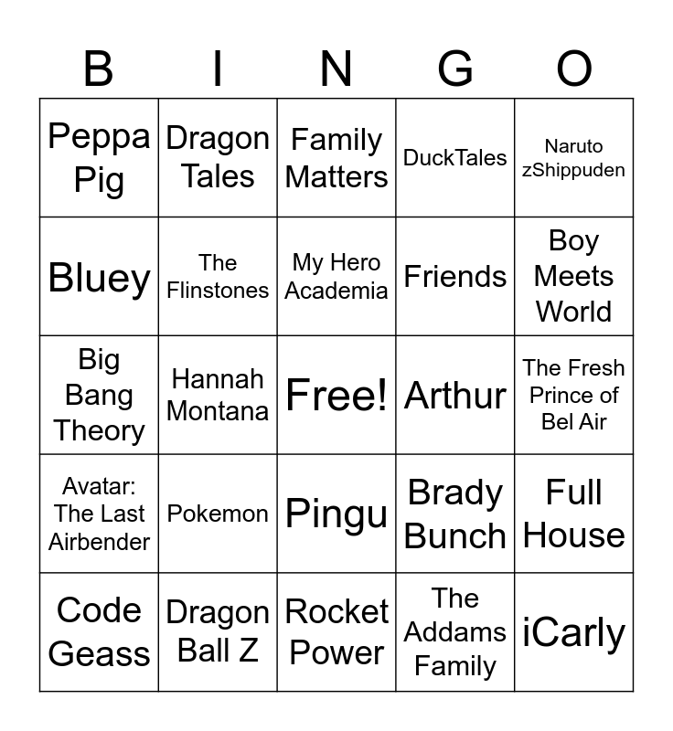 This bingo card has a free space and 24 words: Pokemon, Dragon Ball Z, My Hero Academia, Code Geass, Naruto zShippuden, Peppa Pig, Bluey, Dragon Tales, Arthur, Pingu, Friends, Big Bang Theory, Brady Bunch, Full House, The Flinstones, The Addams Family, The Fresh Prince of Bel Air, Family Matters, Boy Meets World, Hannah Montana, iCarly, Avatar: The Last Airbender, DuckTales and Rocket Power.