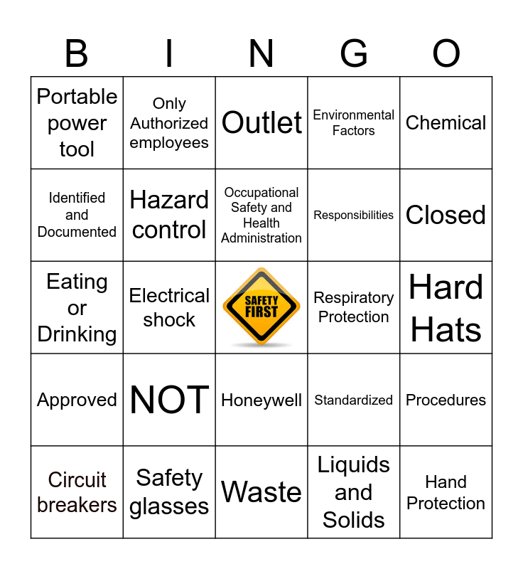 This bingo card has a free space and 29 words: Circuit breakers, Properly protected, Electrical shock, (Hot) conductor, Portable power tool, Outlet, Hazard control, NOT, Respiratory Protection, Safety glasses, Hard Hats, Hand Protection, Waste, Liquids and Solids, Closed, Drums, Honeywell, Approved, Chemical, Eating or Drinking, Standardized, Good Housekeeping, Responsibilities, Identified and Documented, Environmental Factors, Only Authorized employees, Procedures, Occupational Safety and Health Administration and Accident.