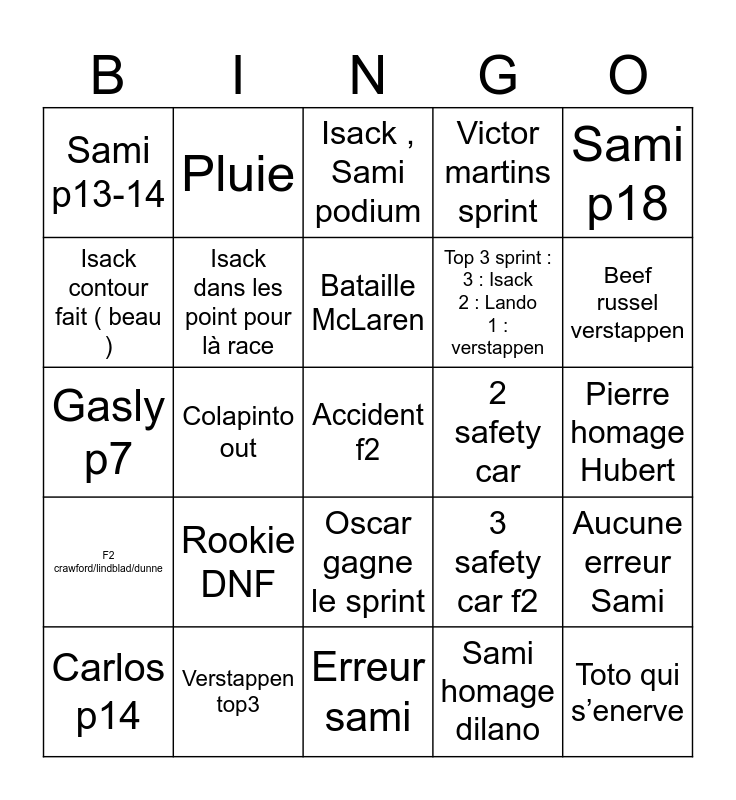 This bingo card has a free space and 24 words: Rookie DNF, Verstappen top3, Bataille McLaren, Carlos p14, Sami p18, Sami p13-14, Isack contour fait ( beau ), Pluie, 2 safety car, Oscar gagne le sprint, Top 3 sprint : 3 : Isack 2 : Lando 1 : verstappen, Gasly p7, 3 safety car f2, Aucune erreur Sami, Isack dans les point pour là race, Sami homage dilano, Pierre homage Hubert, Isack , Sami podium, Beef russel verstappen, Colapinto out, Toto qui s’enerve, F2 crawford/lindblad/dunne, Victor martins sprint and Erreur sami.