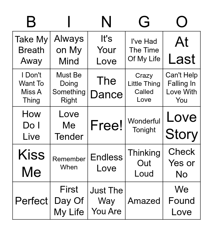 This bingo card has a free space and 54 words: Heaven, Kiss Me, You're Still The One, I Will Always Love You, Endless Love, A Thousand Miles, I've Had The Time Of My Life, Crazy In Love, I Don't Want To Miss A Thing, All of Me, Take My Breath Away, Halo, First Day Of My Life, Perfect, A Thousand Years, Just The Way You Are, We Found Love, Crazy Little Thing Called Love, Teenage Dream, Love Story, Thinking Out Loud, Every Breath You Take, Wonderful Tonight, At Last, Islands In The Stream, Always on My Mind, When You Say Nothing At All, Forever and Ever Amen, Lookin' For Love, Amazed, I Swear, Your Love Amazes Me, Meet Me In The Middle, Cowboy Take Me Away, It's Your Love, This Kiss, How Do I Live, Check Yes or No, She's In Love With A Boy, Must Be Doing Something Right, Your Man, I Cross My Heart, I Love The Way You Love Me, Bless The Broken Road, Remember When, Beautiful Crazy, In Case You Didn't Know, Forever After All, The Dance, Love Me Tender, Can't Help Falling In Love With You, My Girl, Stand By Me and Hungry Eyes.
