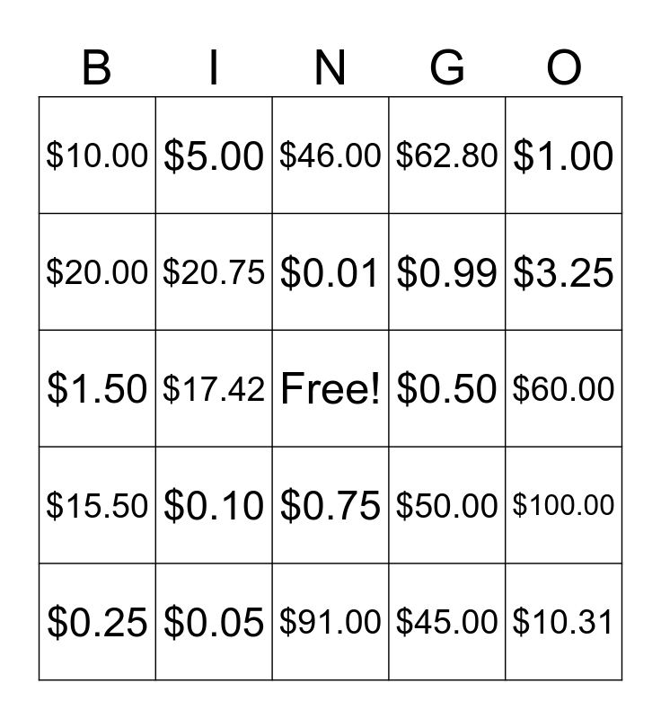 This bingo card has a free space and 24 words: $0.10, $0.05, $0.01, $0.25, $1.00, $10.00, $20.00, $5.00, $0.50, $0.75, $0.99, $1.50, $50.00, $100.00, $20.75, $45.00, $60.00, $46.00, $3.25, $17.42, $10.31, $15.50, $62.80 and $91.00.
