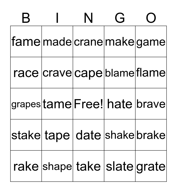 This bingo card has a free space and 24 words: tape, shape, cape, rake, game, fame, race, made, hate, date, blame, grapes, shake, brake, crave, slate, brave, crane, flame, tame, grate, stake, make and take.