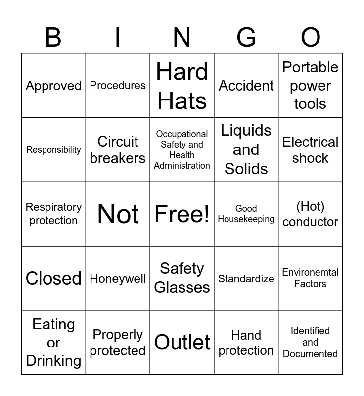 This bingo card has a free space and 29 words: Eating or Drinking, Drums, Not, Chemicals, Approved, Hard Hats, Circuit breakers, Honeywell, Good Housekeeping, Properly protected, (Hot) conductor, Identified and Documented, Outlet, Hand protection, Electrical shock, Hazard control, Safety Glasses, Closed, Portable power tools, Respiratory protection, Standardize, Waste, Liquids and Solids, Responsibility, Accident, Procedures, Environemtal Factors, Occupational Safety and Health Administration and Only authorized employees.