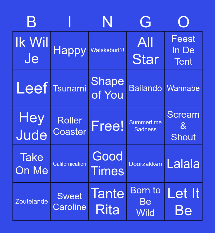 This bingo card has a free space and 74 words: Ik Neem Je Mee, Drank & Drugs, Watskeburt?!, Billie Jean, Dancing Queen, Bohemian Rhapsody, Blinding Lights, Uptown Funk, Zoutelande, Sexy Als Ik Dans, Livin’ on a Prayer, Smells Like Teen Spirit, Shape of You, Leef, Rhythm of the Night, Roller Coaster, Vrouwkes, Wannabe, Girls Just Want to Have Fun, Hey Jude, Tsunami, Happy, All Star, Wonderwall, Let It Be, Firestarter, Shallow, Dance Monkey, I Gotta Feeling, Despacito, Feest In De Tent, No Limit, Parijs, Zij Weet Het, I Want It That Way, Born to Be Wild, Toxic, Feel So Close, Every Breath You Take, Freed from Desire, Tante Rita, Sweet Caroline, Poker Face, Wake Me Up, One More Time, Ik Wil Je, Poker Face, Californication, Leef, Dronken Disco Dansen, Numb, Satisfaction, Scream & Shout, This Is What You Came For, Vrijdagmiddag Hossel, Shotgun, Good Times, Kroegentocht, Let’s Dance, Lalala, Bailando, Blijven Feesten, Take On Me, Dancing in the Moonlight, Summertime Sadness, Stereo Love, Cheap Thrills, Dance With Somebody, Doorzakken, Higher Love, Taki Taki, Rather Be, Blijf Bij Mij and Hey Brother.