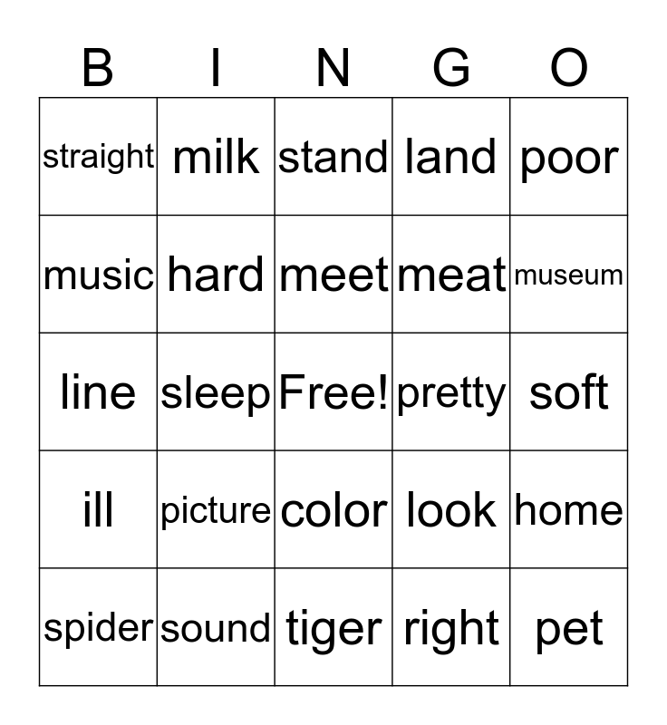 This bingo card has a free space and 29 words: spider, tooth, sleep, left, straight, stand, hard, picture, pretty, sound, soft, pet, tiger, right, museum, park, color, ill, poor, line, look, shoulder, meat, music, land, milk, home, meet and kid.