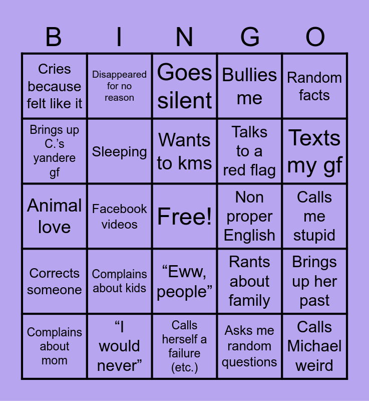 This bingo card has a free space and 24 words: Complains about mom, Complains about kids, Wants to kms, Asks me random questions, Random facts, Cries because felt like it, Disappeared for no reason, Goes silent, Non proper English, Calls me stupid, Animal love, Sleeping, Rants about family, Brings up her past, Brings up C.’s yandere gf, “I would never”, Calls herself a failure (etc.), Bullies me, Texts my gf, Corrects someone, Facebook videos, “Eww, people”, Talks to a red flag and Calls Michael weird.