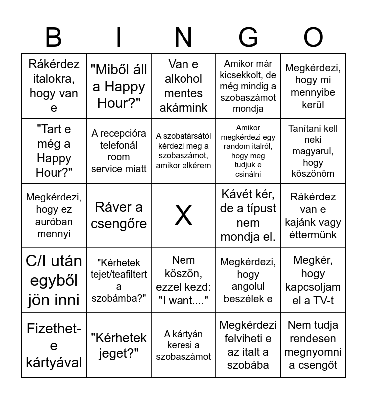 This bingo card has a free space and 24 words: "Kérhetek tejet/teafiltert a szobámba?", "Kérhetek jeget?", A szobatársától kérdezi meg a szobaszámot, amikor elkérem, Fizethet-e kártyával, Megkérdezi, hogy mi mennyibe kerül, Rákérdez italokra, hogy van e, "Tart e még a Happy Hour?", "Miből áll a Happy Hour?", Kávét kér, de a típust nem mondja el., Nem köszön, ezzel kezd: "I want....", Amikor megkérdezi egy random italról, hogy meg tudjuk e csinálni, Megkérdezi, hogy ez auróban mennyi, Megkérdezi, hogy angolul beszélek e, Megkér, hogy kapcsoljam el a TV-t, A recepcióra telefonál room service miatt, Megkérdezi felviheti e az italt a szobába, Rákérdez van e kajánk vagy éttermünk, Van e alkohol mentes akármink, Tanítani kell neki magyarul, hogy köszönöm, Ráver a csengőre, Nem tudja rendesen megnyomni a csengőt, C/I után egyből jön inni, Amikor már kicsekkolt, de még mindig a szobaszámot mondja and A kártyán keresi a szobaszámot.