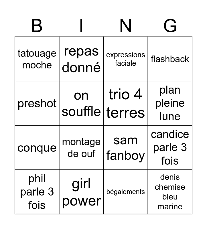This bingo card has 16 words: girl power, candice parle 3 fois, expressions faciale, tatouage moche, conque, repas donné, sam fanboy, bégaiements, preshot, on souffle, phil parle 3 fois, flashback, montage de ouf, plan pleine lune, trio 4 terres and denis chemise bleu marine.