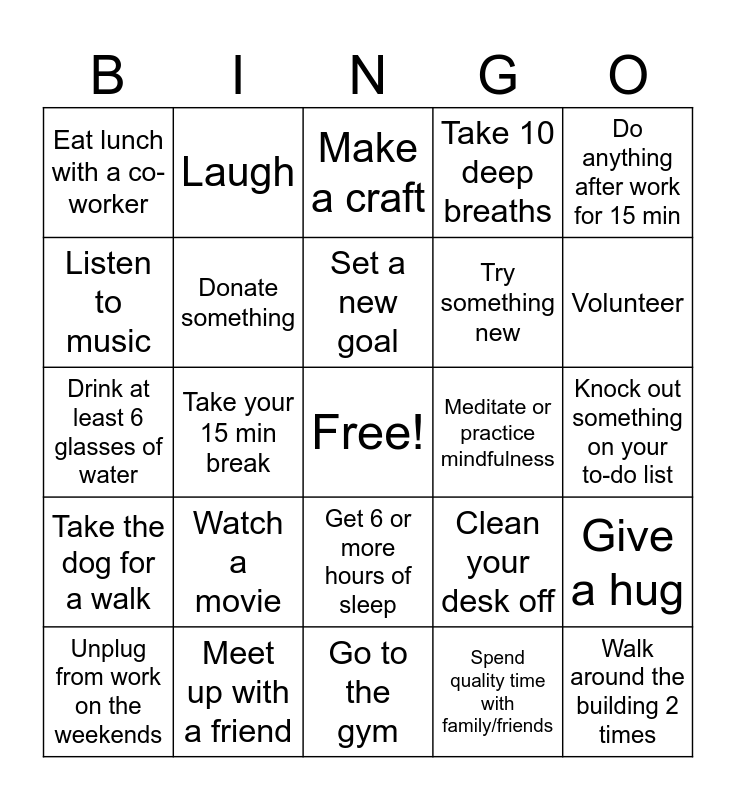 This bingo card has a free space and 29 words: Unplug from work on the weekends, Read a book, Take your 15 min break, Take a nap, Eat lunch with a co-worker, Make a craft, Donate something, Watch a movie, Meditate or practice mindfulness, Meet up with a friend, Knock out something on your to-do list, Walk around the building 2 times, Go to the gym, Spend quality time with family/friends, Volunteer, Have a healthy snack at home or at work, Get 6 or more hours of sleep, Take the dog for a walk, Do anything after work for 15 min, Drink at least 6 glasses of water, Clean your desk off, Say something nice about a co-worker and put it on their door/cubicle, Try something new, Listen to music, Take 10 deep breaths, Laugh, Give a hug, Set a new goal and Unplug at least 30 min before bed.