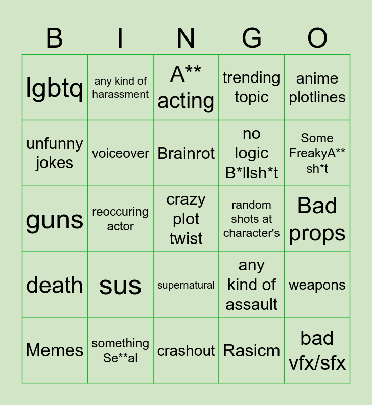 This bingo card has a free space and 24 words: sus, something Se**al, Brainrot, Memes, anime plotlines, lgbtq, unfunny jokes, any kind of harassment, random shots at character's, supernatural, no logic B*llsh*t, guns, any kind of assault, weapons, voiceover, Rasicm, Bad props, A** acting, Some FreakyA** sh*t, reoccuring actor, bad vfx/sfx, death, trending topic and crashout.