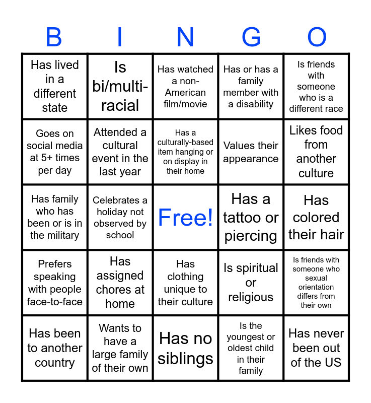 This bingo card has a free space and 29 words: Has been to another country, Listens to music, Celebrates a holiday not observed by school, Has a name with cultural or religious significance, Has lived in a different state, Has watched a non-American film/movie, Attended a cultural event in the last year, Has assigned chores at home, Has a tattoo or piercing, Wants to have a large family of their own, Has colored their hair, Has never been out of the US, Has no siblings, Is the youngest or oldest child in their family, Likes food from another culture, Has had their name mispronounced, Has clothing unique to their culture, Prefers speaking with people face-to-face, Is friends with someone who is a different race, Has family who has been or is in the military, Is spiritual or religious, Speaks more than 1 language fluently, Values their appearance, Goes on social media at 5+ times per day, Has or has a family member with a disability, Is bi/multi-racial, Is friends with someone who sexual orientation differs from their own, Has a culturally-based item hanging or on display in their home and Lives in a single-parent home.