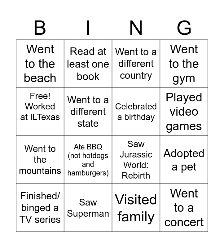 This bingo card has 16 words: Saw Superman, Adopted a pet, Went to a different country, Went to the beach, Went to the mountains, Read at least one book, Saw Jurassic World: Rebirth, Visited family, Free! Worked at ILTexas, Went to a different state, Finished/ binged a TV series, Went to the gym, Ate BBQ (not hotdogs and hamburgers), Played video games, Celebrated a birthday and Went to a concert.