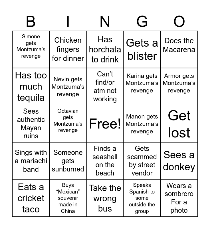 This bingo card has a free space and 24 words: Eats a cricket taco, Someone gets sunburned, Can’t find/or atm not working, Speaks Spanish to some outside the group, Does the Macarena, Simone gets Montzuma’s revenge, Chicken fingers for dinner, Has horchata to drink, Manon gets Montzuma’s revenge, Get lost, Sees authentic Mayan ruins, Nevin gets Montzuma’s revenge, Gets scammed by street vendor, Sees a donkey, Has too much tequila, Buys “Mexican” souvenir made in China, Take the wrong bus, Gets a blister, Armor gets Montzuma’s revenge, Sings with a mariachi band, Octavian gets Montzuma’s revenge, Finds a seashell on the beach, Karina gets Montzuma’s revenge and Wears a sombrero For a photo.