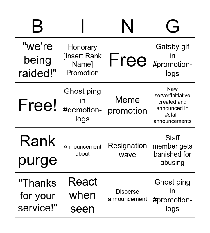 This bingo card has 16 words: React when seen, Staff member gets banished for abusing, Free, "we're being raided!", Rank purge, Honorary [Insert Rank Name] Promotion, Resignation wave, Disperse announcement, Free!, Ghost ping in #demotion-logs, "Thanks for your service!", Gatsby gif in #promotion-logs, Announcement about, New server/initiative created and announced in #staff-announcements, Meme promotion and Ghost ping in #promotion-logs.